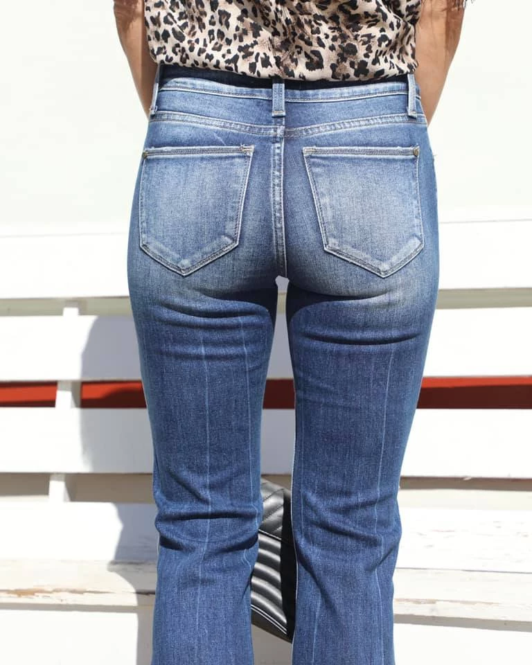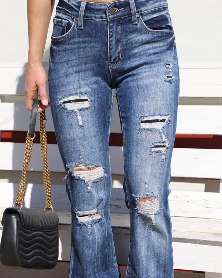 – Mid-rise flare silhouette – Distressed patches