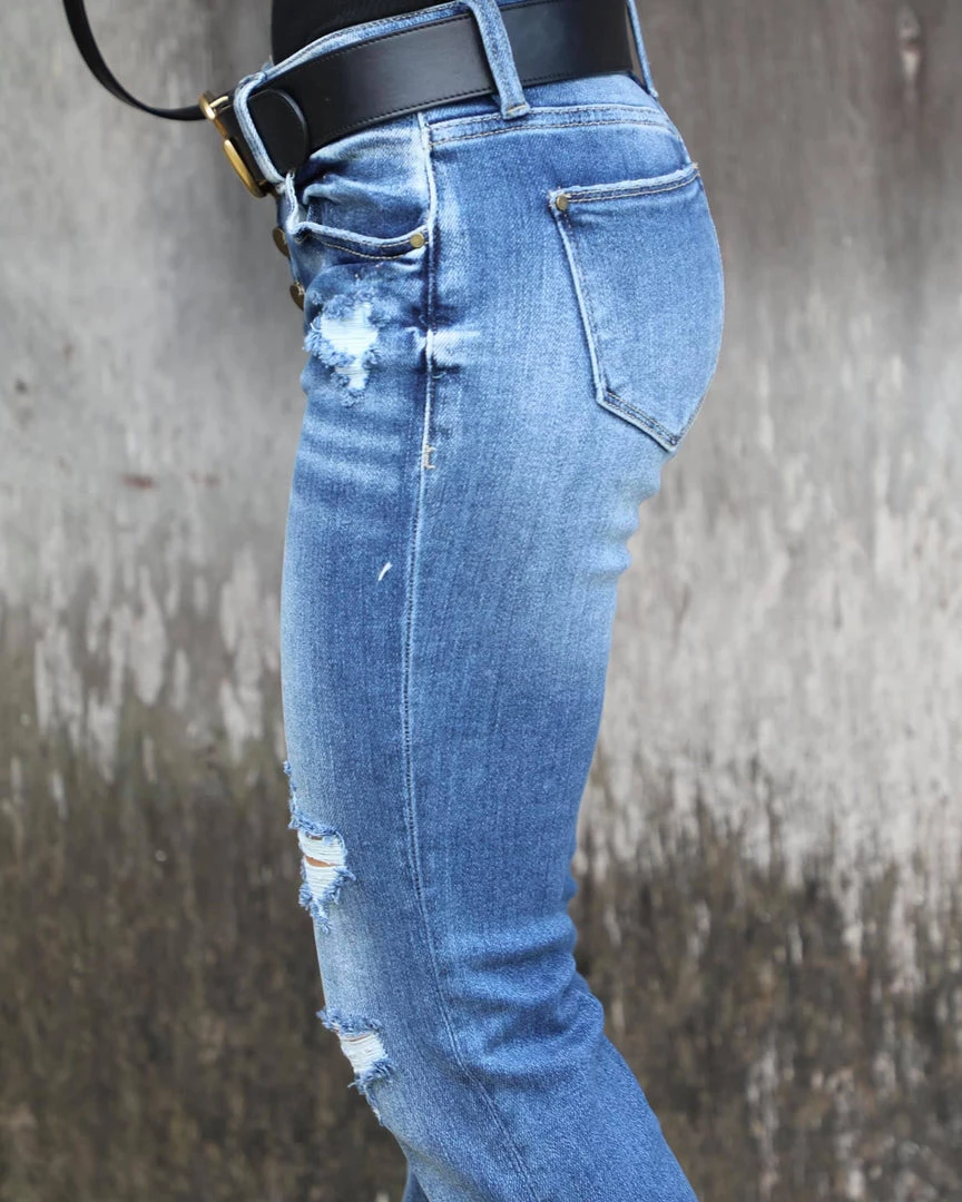 BUTTON UP DISTRESSED LOW RISE STRETCH FLARE
