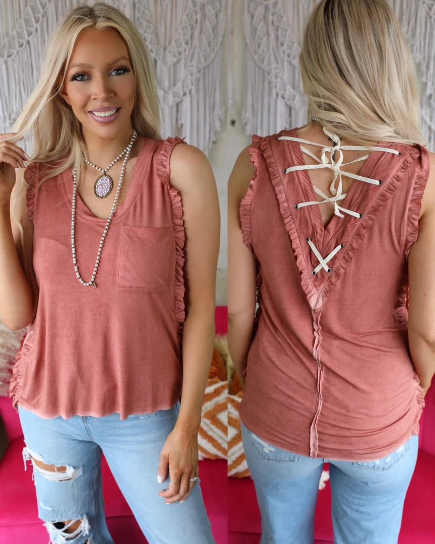 Brick Red Lace-Up Back Ruffle Tank Top by POL.