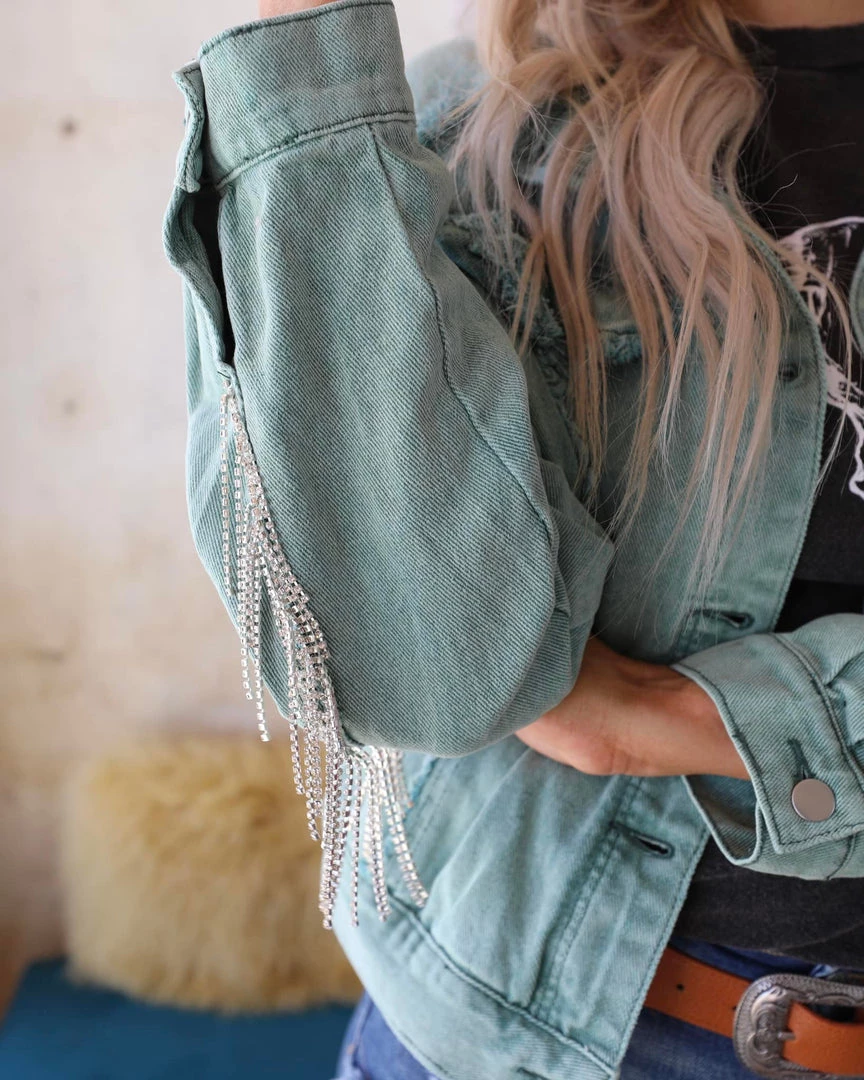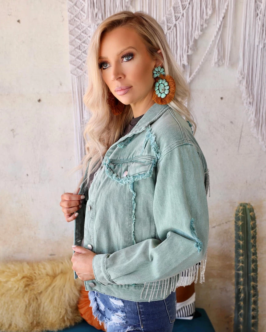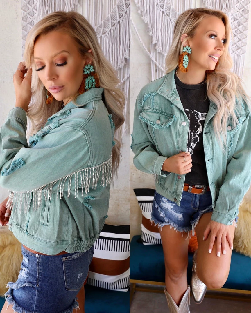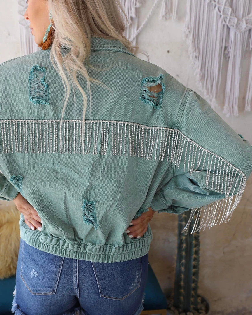 Designed in standing collar jacket, relaxed fit with back elastic band, featured in twill denim with fringe trim.