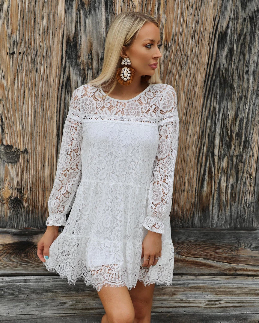 Long sleeve with lace details. Dress is lined. Kelsey is size 3 and 5’9” wearing the small