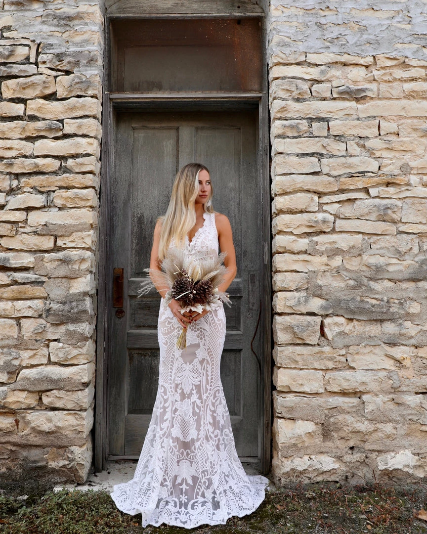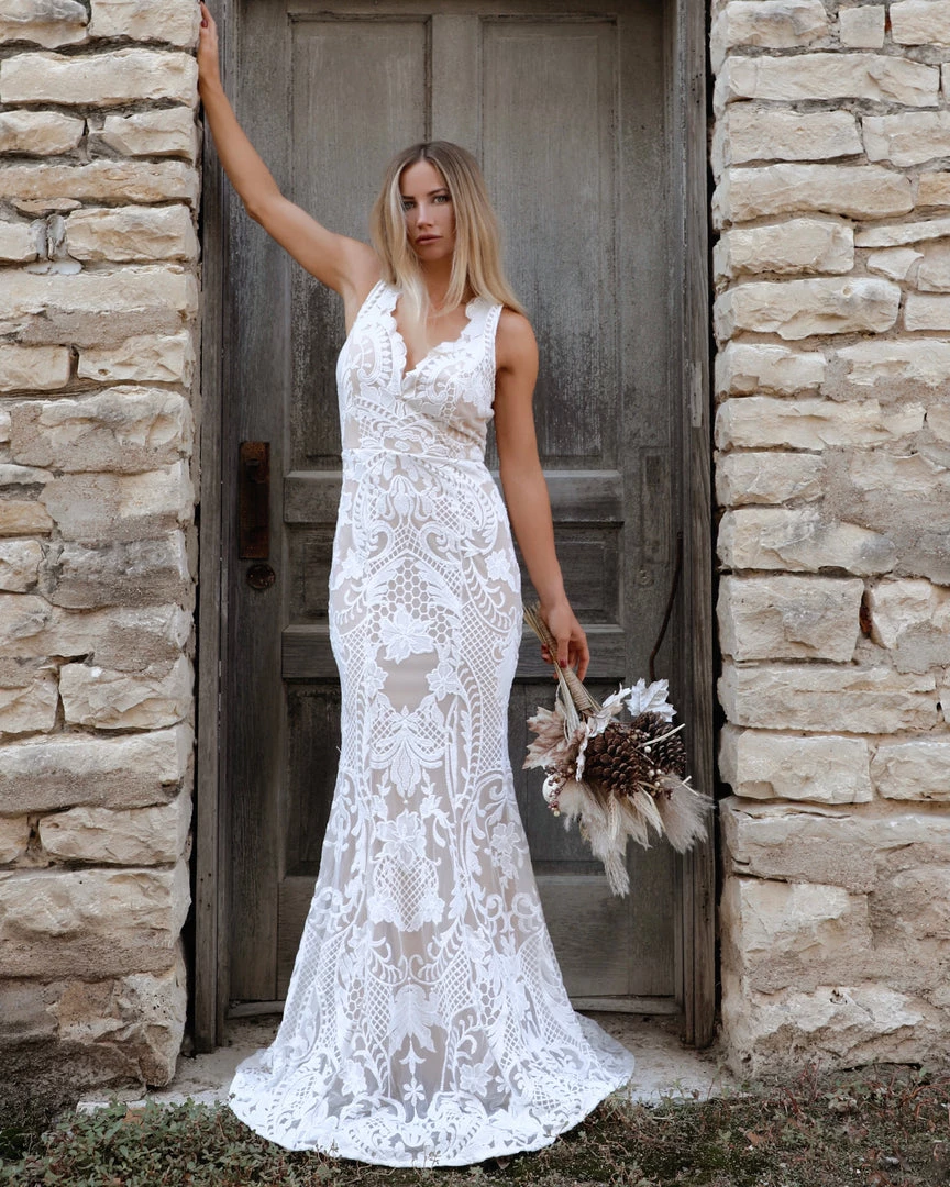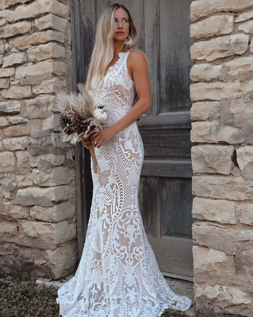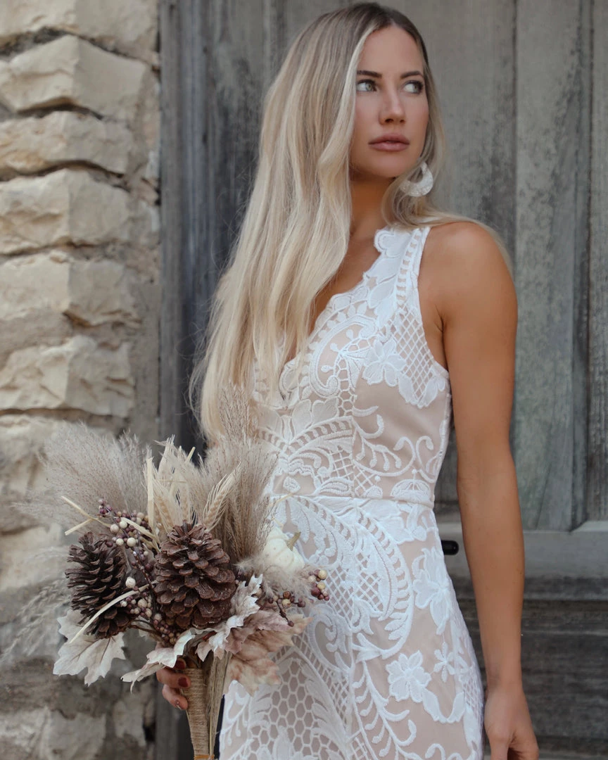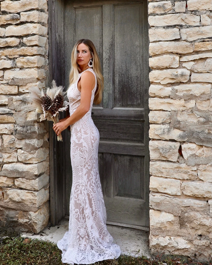 White and nude lined maxi dress.
