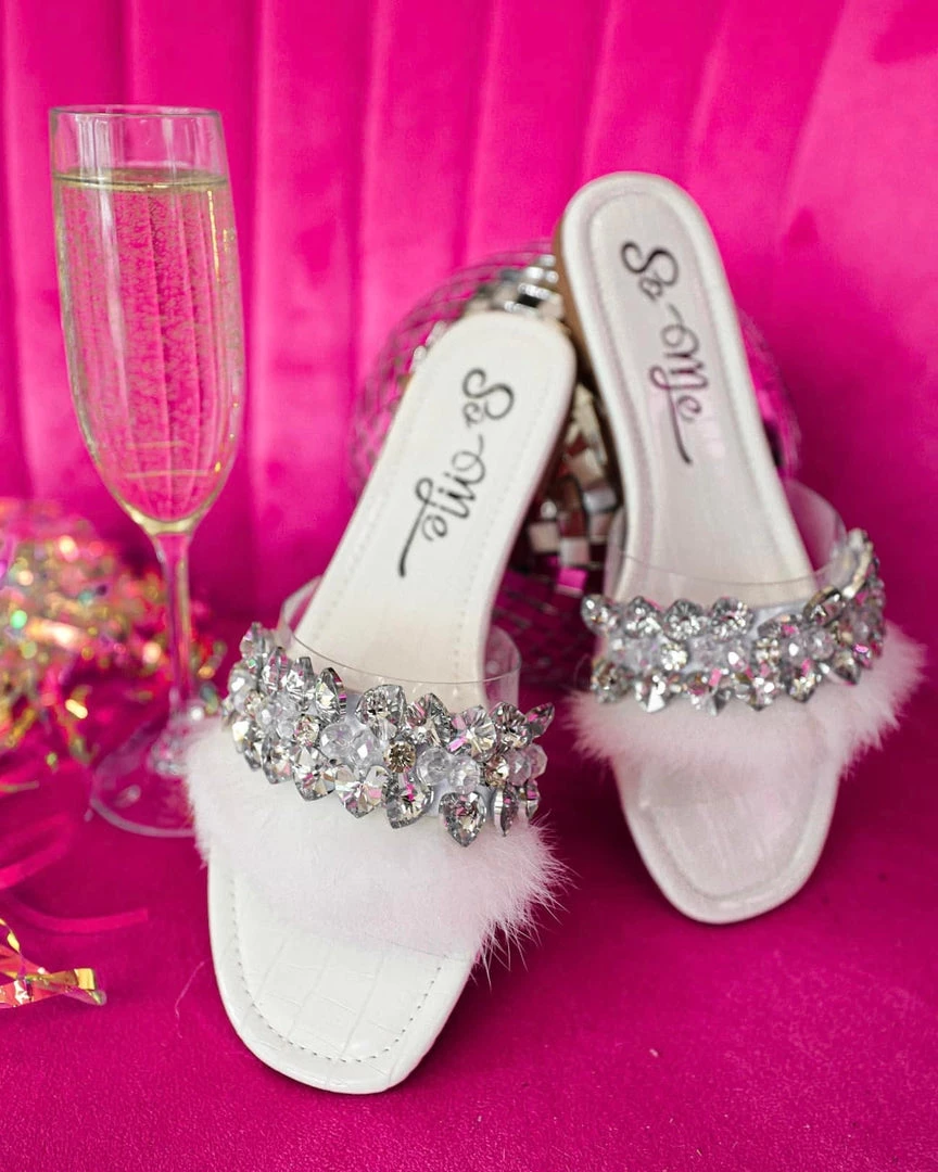 - White Bling and Fur Slide on Sandals