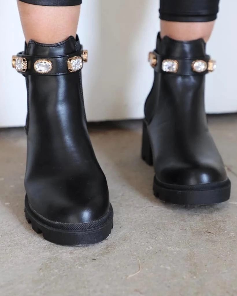 Black Flat boot with chunky sole and belted gold rhinestone detail
