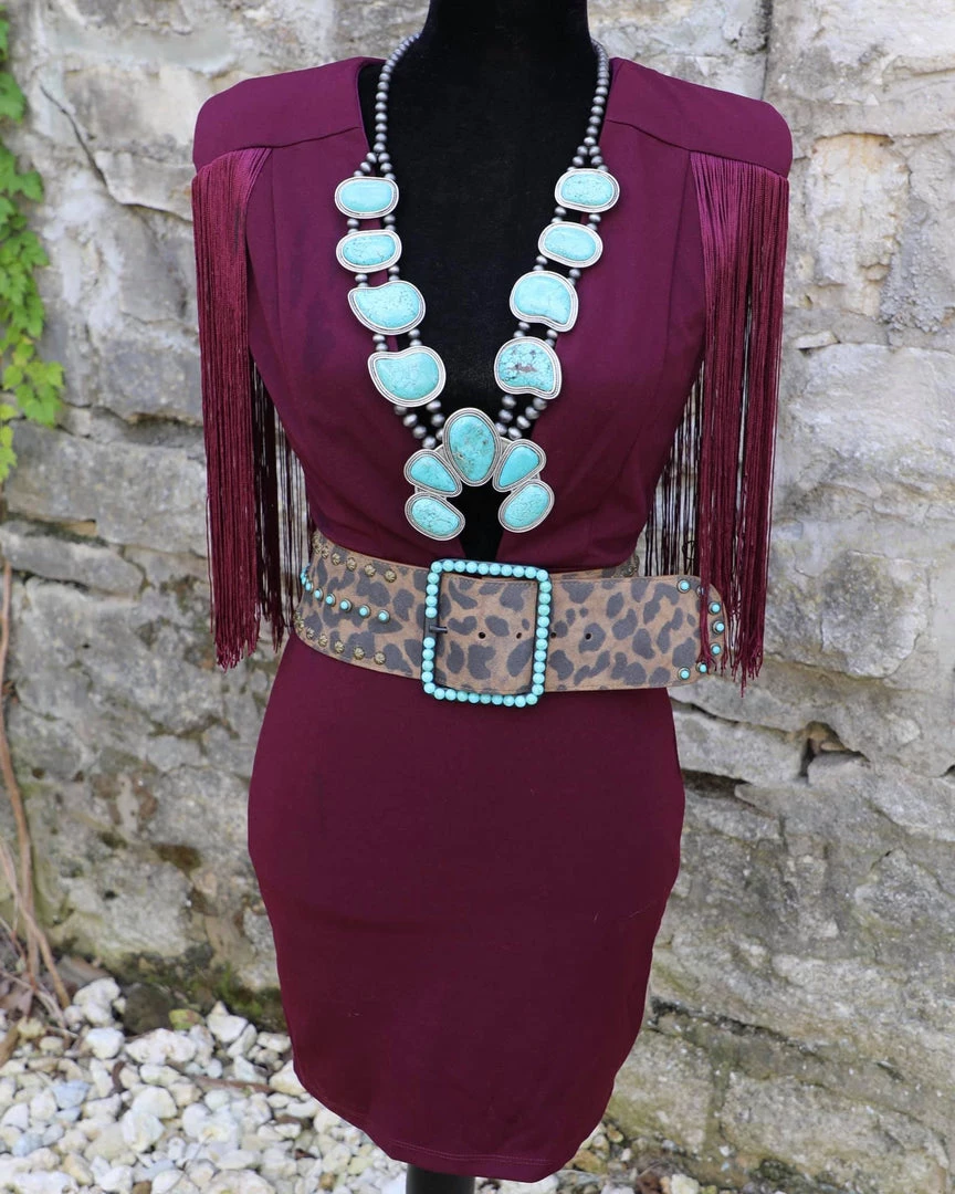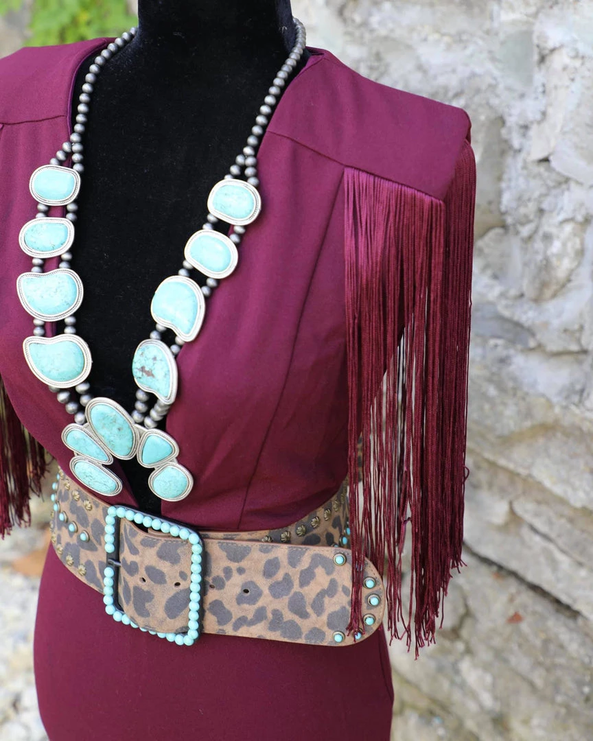Does have stretch with shoulder pads and gorgeous 14” fringe