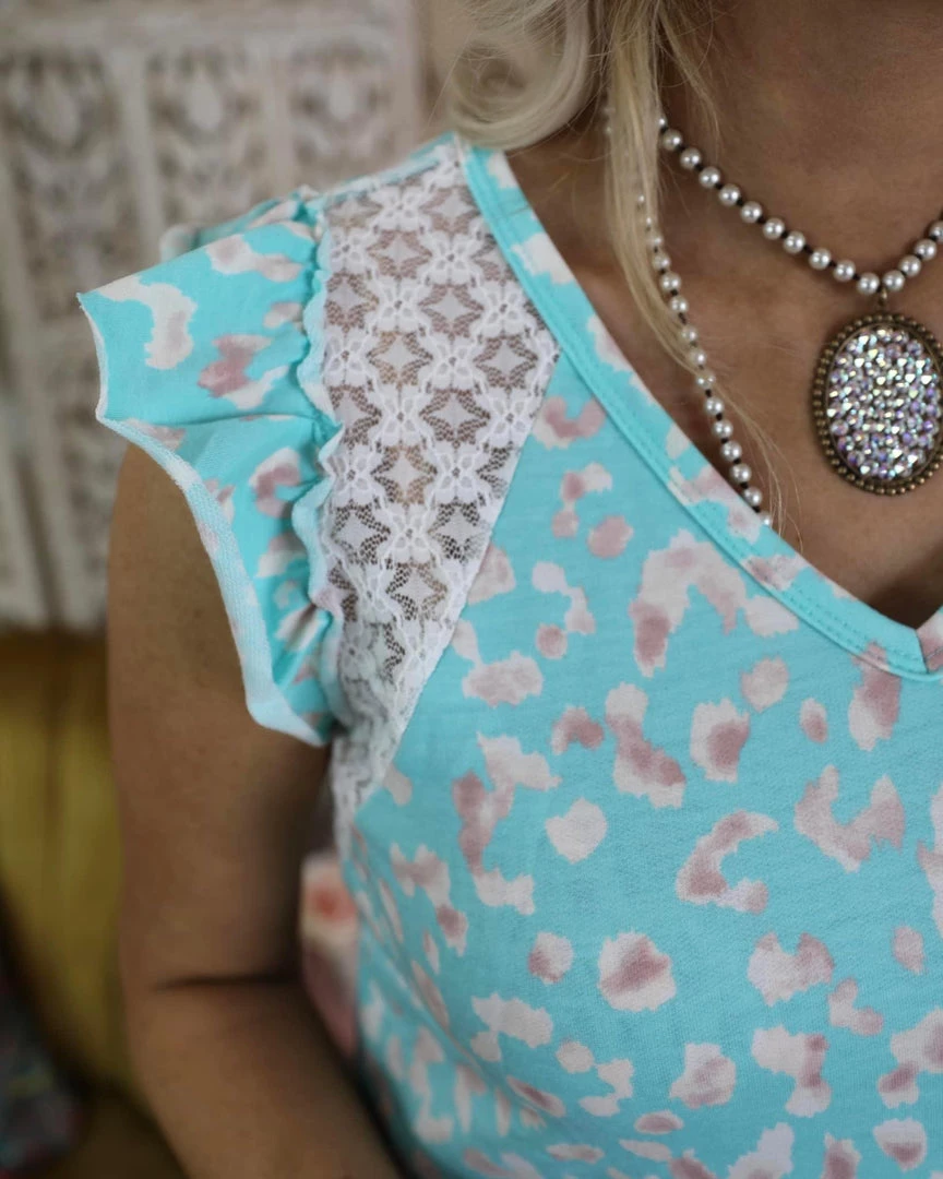 MULTI COLOR LEOPARD PRINTED FRENCH TERRY KNIT WITH LACE YOKE DETAILED RUFFLE SLEEVE TOP