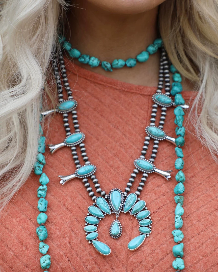 SKU: the-lace-cactus-7091575488689 Categories: Best Sellers, Jewelry, Necklaces Tags: Jan22, Jewelry, Necklace, Restock, Squash blossom, Squash necklace, Turquoise
