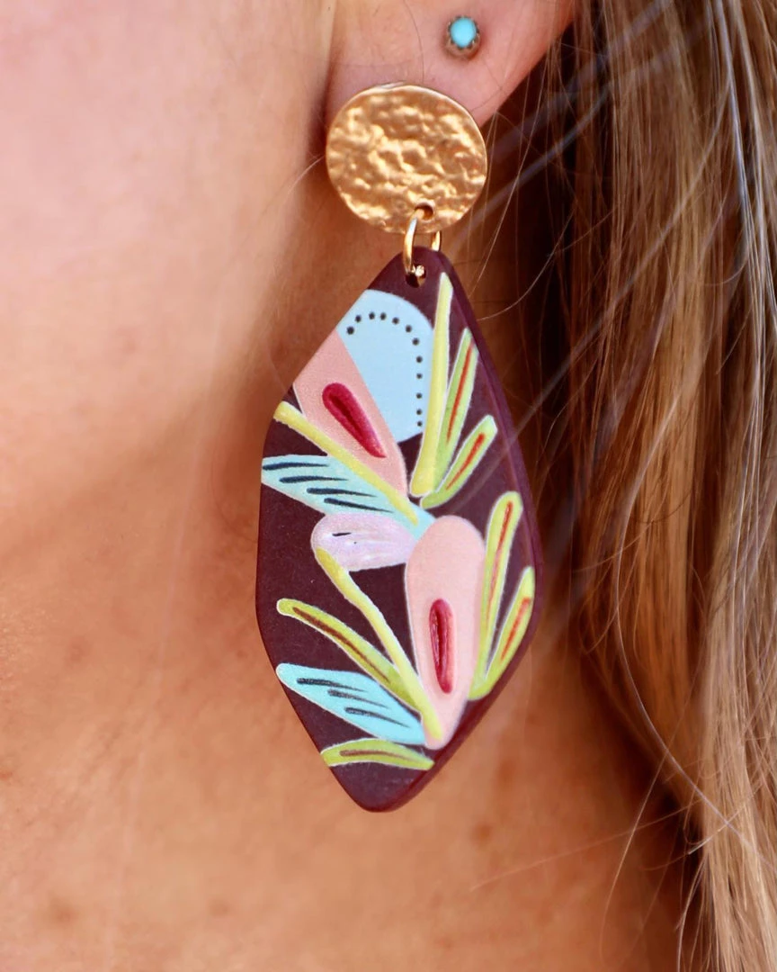 Brown acrylic irregular shape with painted abstract flowers, topped with a round hammered alloy stud in matte gold painting post earrings