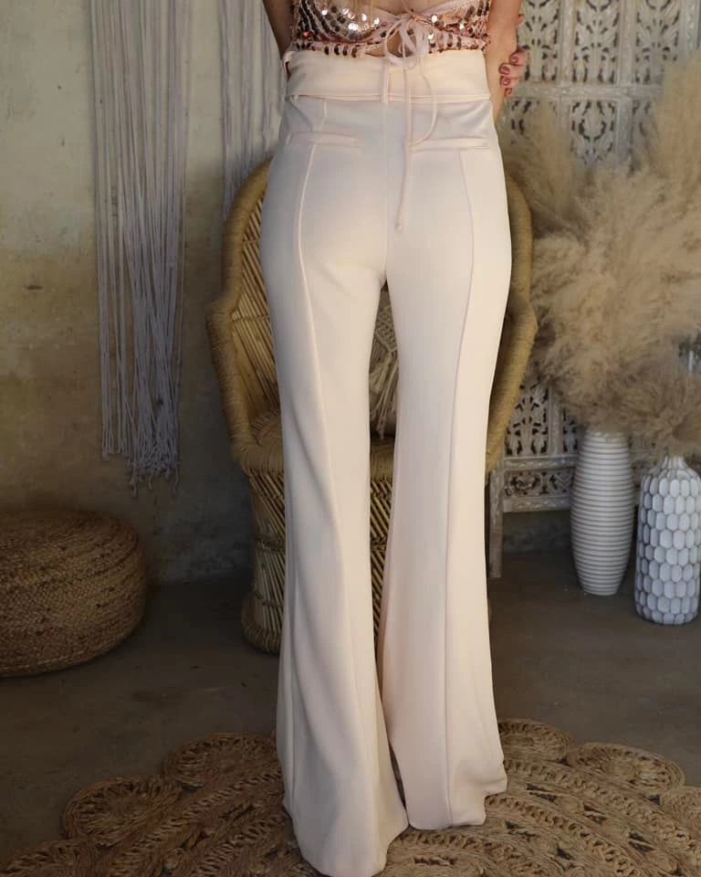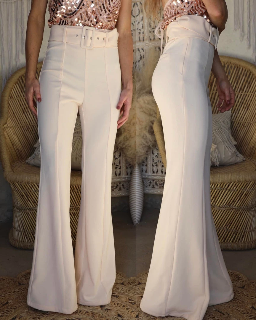 A solid woven flared pant featuring bell bottom, self-belt with rectangular buckle, and side pockets