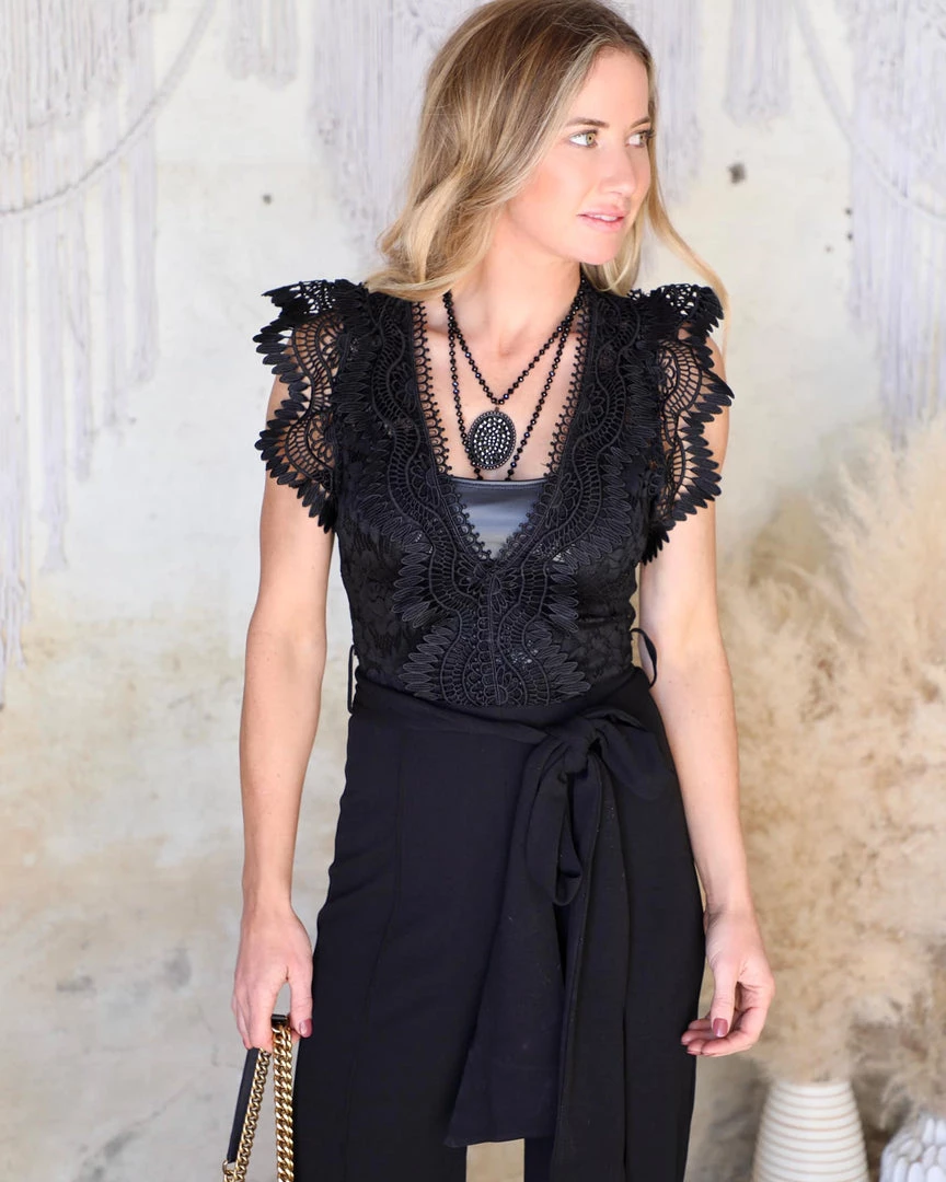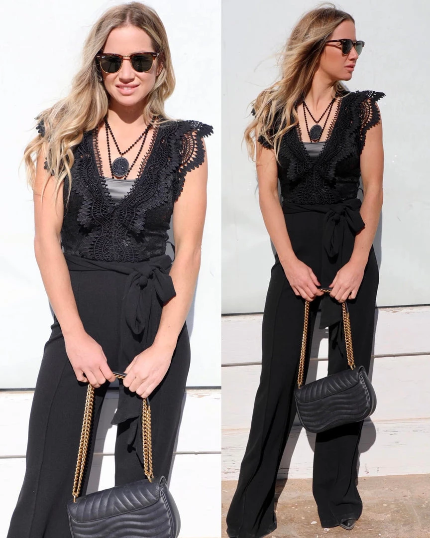 Waist tie with crochet scalloped shoulders, pintuck style trouser bottoms and deep v-neck crochet detail