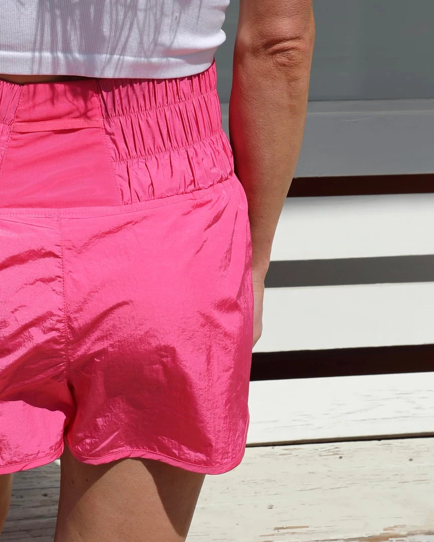 A high-waisted solid woven short with an ultra wide elastic waistband featuring a crossover side. Fabric is a lightweight woven material.