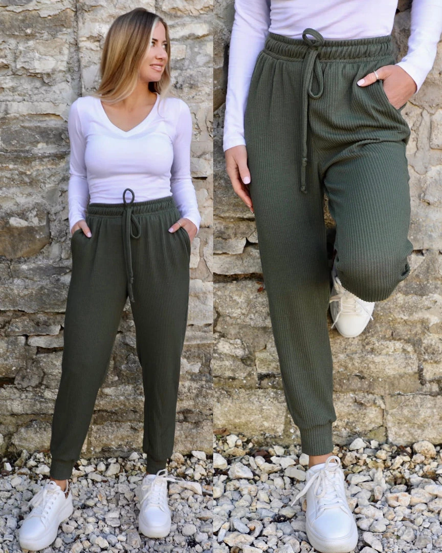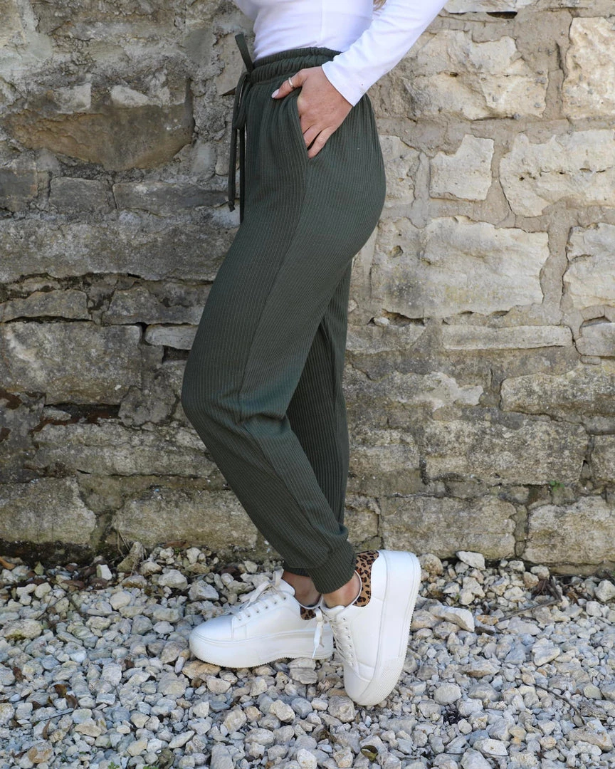 A high waisted solid knit pant with an elastic waist featuring a functional drawstring and side pockets. Fabric is a lightweight textured rib knit.