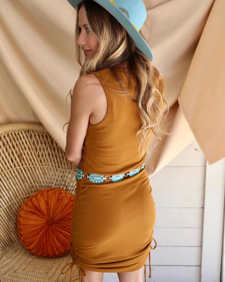 Black ribbed side ruching midi dress with side adjustment tie