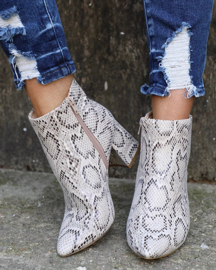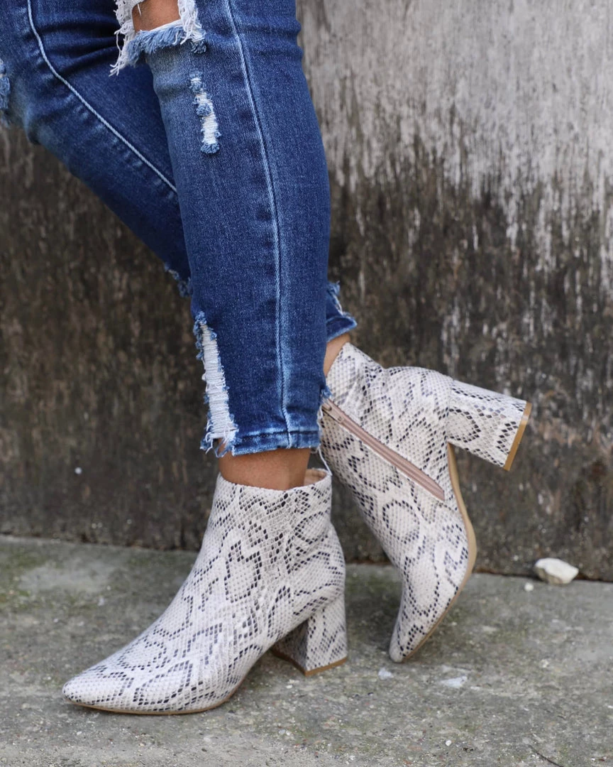 Beige Snakeskin Zip-Up Ankle Booties